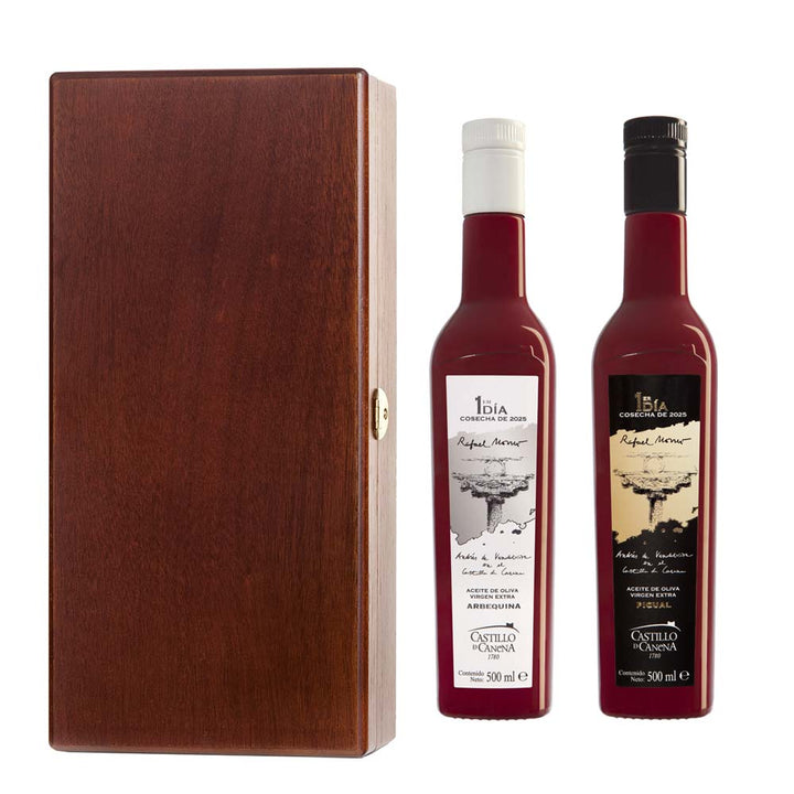 Enthält zwei Flaschen AOVGE als limitierte Auflage, geerntet am ersten Tag der Ernte: Sorten Picual und Arbequina, präsentiert in einer Eichenholzkiste. Degustationsnoten: Picual: Intensiv fruchtig mit Aromen von Gras, Tomatenpflanze, grüner...