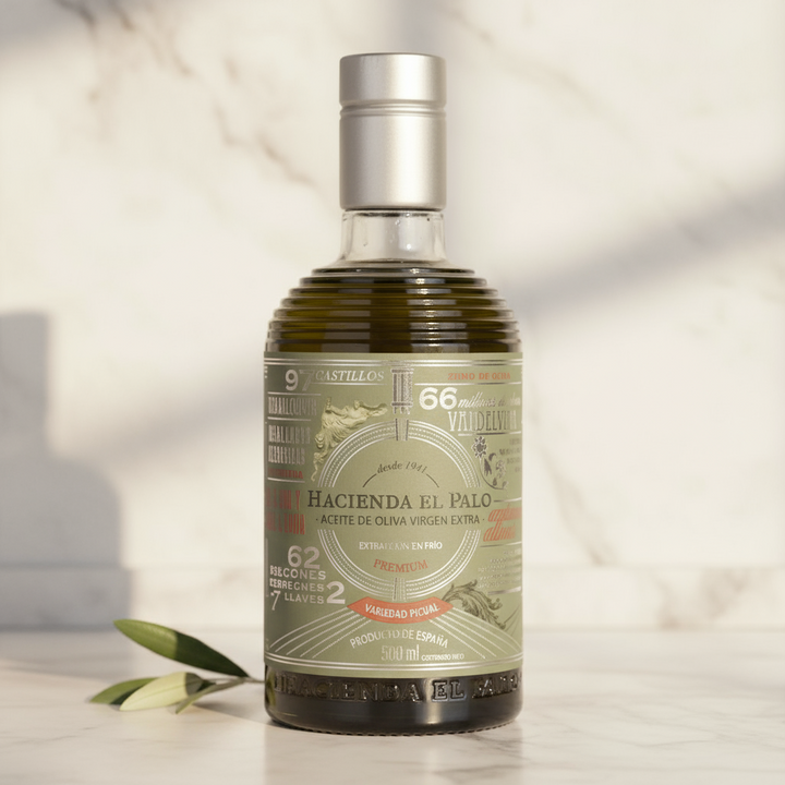 Natives Olivenöl Extra, Sorte Picual von Hacienda el Palo. 500ml Flasche. Frühes natives Olivenöl extra aus der Provinz Jaén. Intensive grüne Farbe, die an das Meer aus Olivenbäumen erinnert, aus dem...