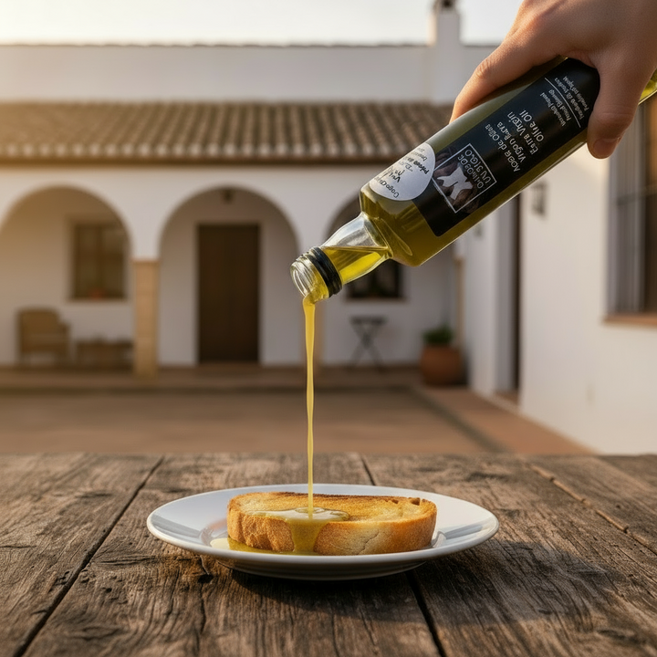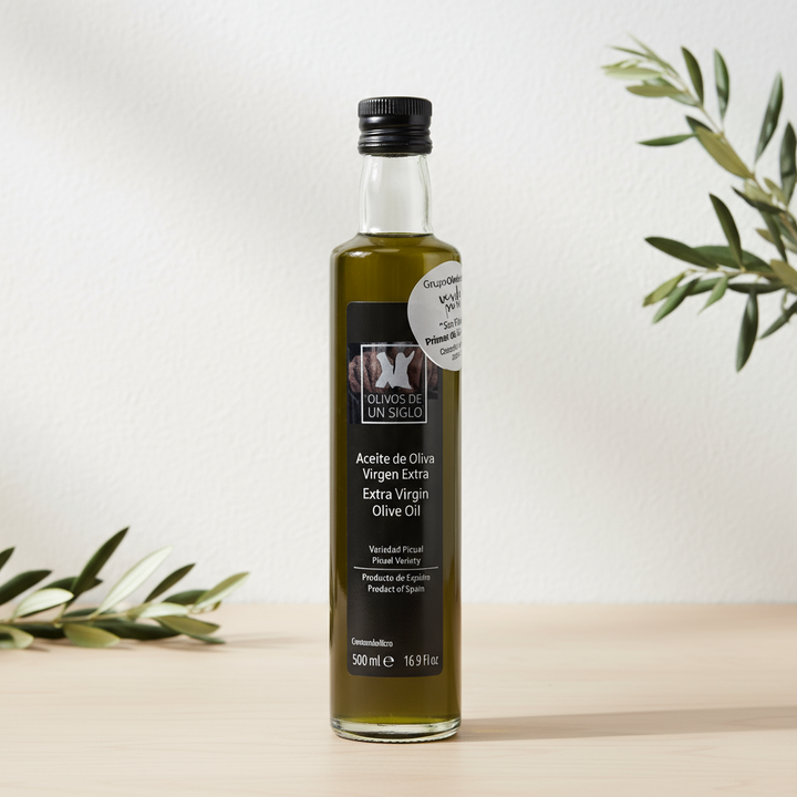 Olivos de un Siglo Erster Tag der Ernte Ungefiltert ist ein früher AOVGE Picual, gewonnen aus Oliven, die in den ersten Tagen der Erntesaison gepflückt wurden.