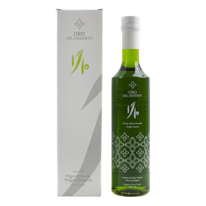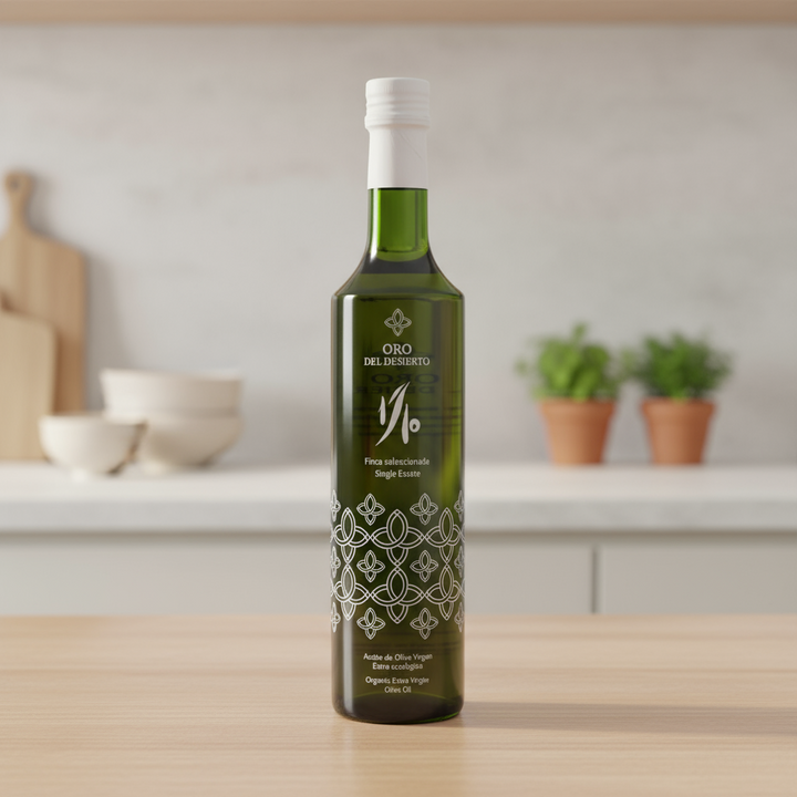 Oro del Desierto Coupage Limitierte Auflage 1/10 500ml ist ein hochwertiges natives Olivenöl extra, hergestellt aus einer sorgfältigen Auswahl von Oliven verschiedener Sorten, um eine ausgewogene und aromatische Coupage zu schaffen. Diese limitierte Edition spiegelt den vollen Ausdruck jeder Sorte und die Exzellenz ihrer Ernte wider.