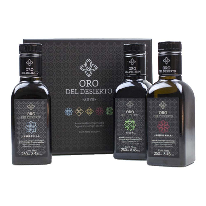 Das Dreifach 250ml Geschenkset von Oro del Desierto vereint drei biologische Einzelsorten-Öle in 250ml-Flaschen, ausgewählt, um eine vollständige sensorische Erfahrung zu bieten. Jedes Öl spiegelt die Reinheit und den Charakter seiner Sorte wider, ideal zum Verschenken oder für den Genuss zu Hause.