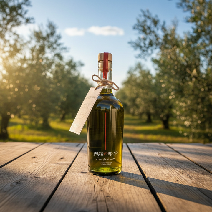 Pago de Espejo Erster Tag der Ernte Limitierte Auflage Picual 500 ml ist ein natives Olivenöl extra von früher Ernte, das ausschließlich aus ausgewählten Picual-Oliven in ihrem optimalen Reifezustand hergestellt wird. Ein exklusives Produkt, das sich durch seine Reinheit, Intensität und Frische auszeichnet.