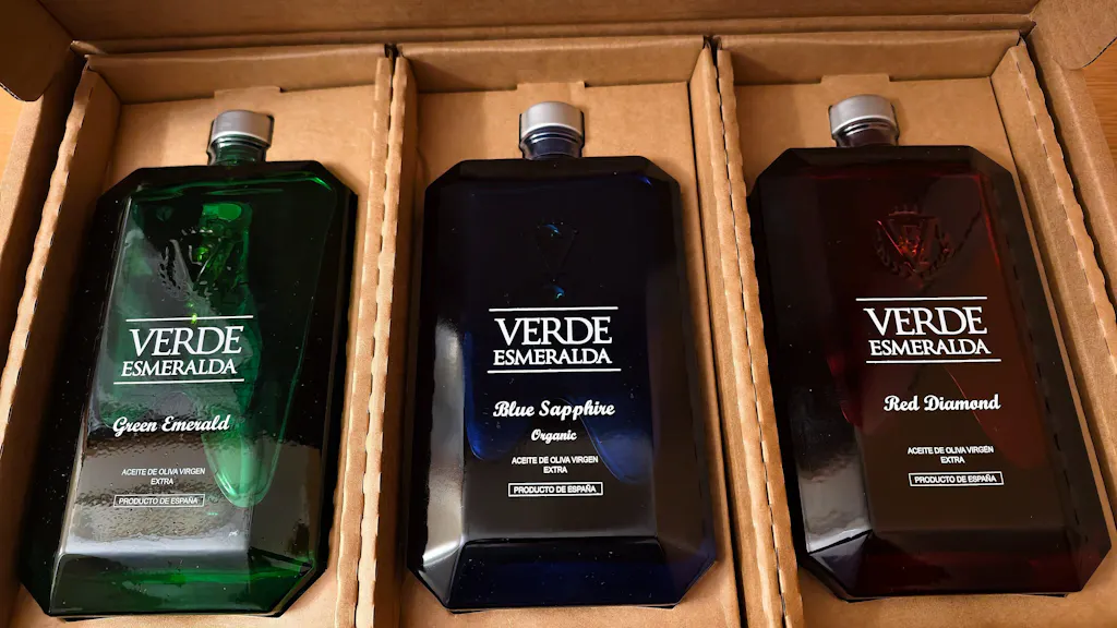 Das Verde Esmeralda Geschenkset Gemmen-Serie 3 Flaschen 500 ml vereint drei hochwertige extra native Olivenöle: Blue Sapphire (Bio-Picual), Red Diamond (Royal) und Green Emerald (Picual). Dieses Set ermöglicht es, verschiedene Profile in einer eleganten Auswahl zu genießen, ideal sowohl zum Verkosten als auch zum Verschenken.
