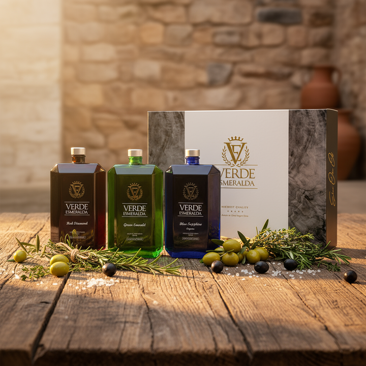 Die Edelstein-Kollektion von Verde Esmeralda vereint drei Juwelen des AOVGE, präsentiert in 500ml-Flaschen, die die Exklusivität und Eleganz der Marke repräsentieren. Jede Sorte wird aus ausgewählten Oliven in früher Ernte hergestellt und garantiert maximale Frische, aromatische Intensität und ein einzigartiges sensorisches Profil.