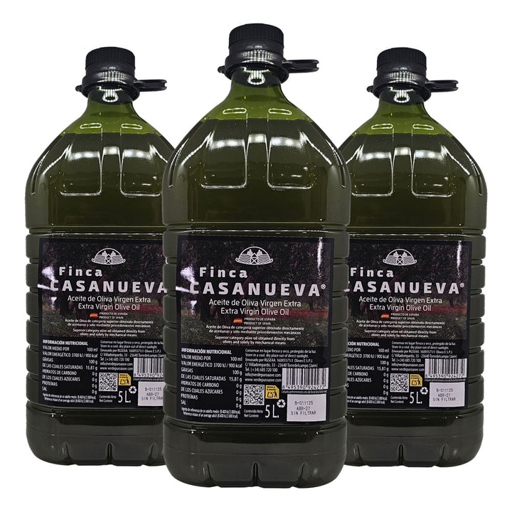 Finca Casanueva Picual Sin Filtrar Garrafa 5L es un aceite de oliva virgen extra obtenido directamente de aceitunas seleccionadas de la variedad Picual, recolectadas en su punto óptimo de maduración y molturadas pocas horas después. Su versión sin filtrar conserva toda la esencia del zumo natural de la aceituna, con un sabor más intenso y una textura ligeramente turbia que refleja su pureza.