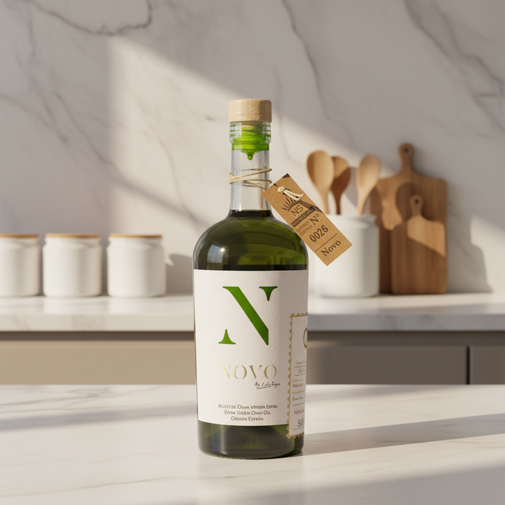 Primer AOVE del año recolectado de olivares de parcela seleccionada. AOVE NOVO se identifica por su color verde oliva. De gran complejidad aromática destacando la hoja del olivo, hierba de trigo, lavanda, tomatera y notas frutales como el plátano verde, la manzana y almendra verde.