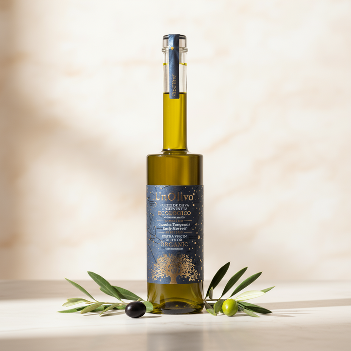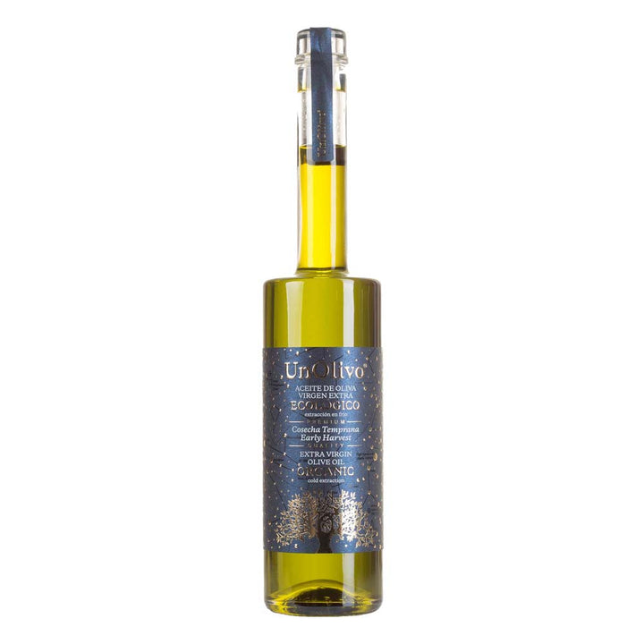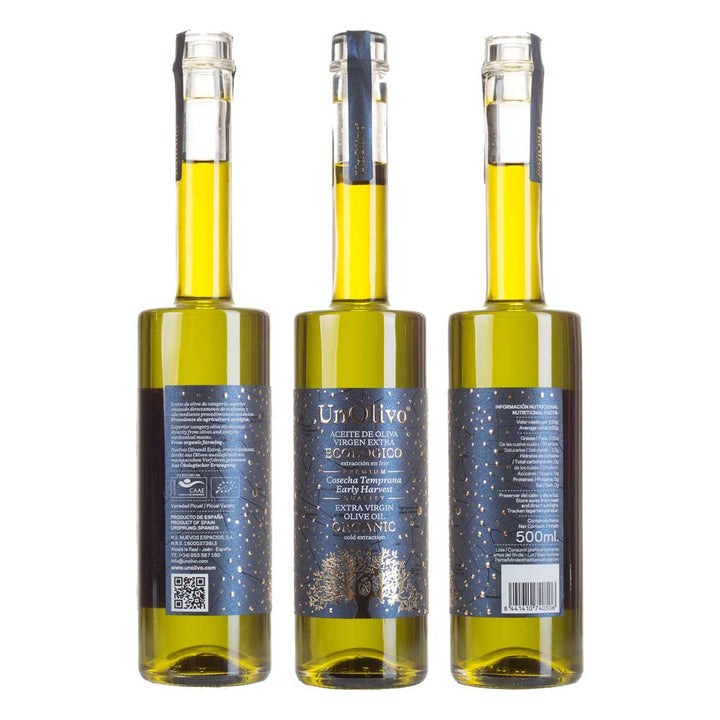 Botella de 500ml de Aceite de Oliva Virgen Extra Ecológico UnOlivo, variedad Picual, cosecha temprana.